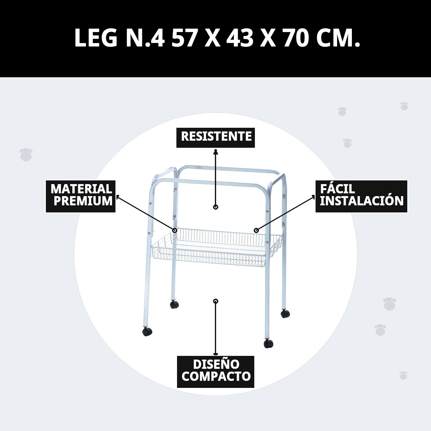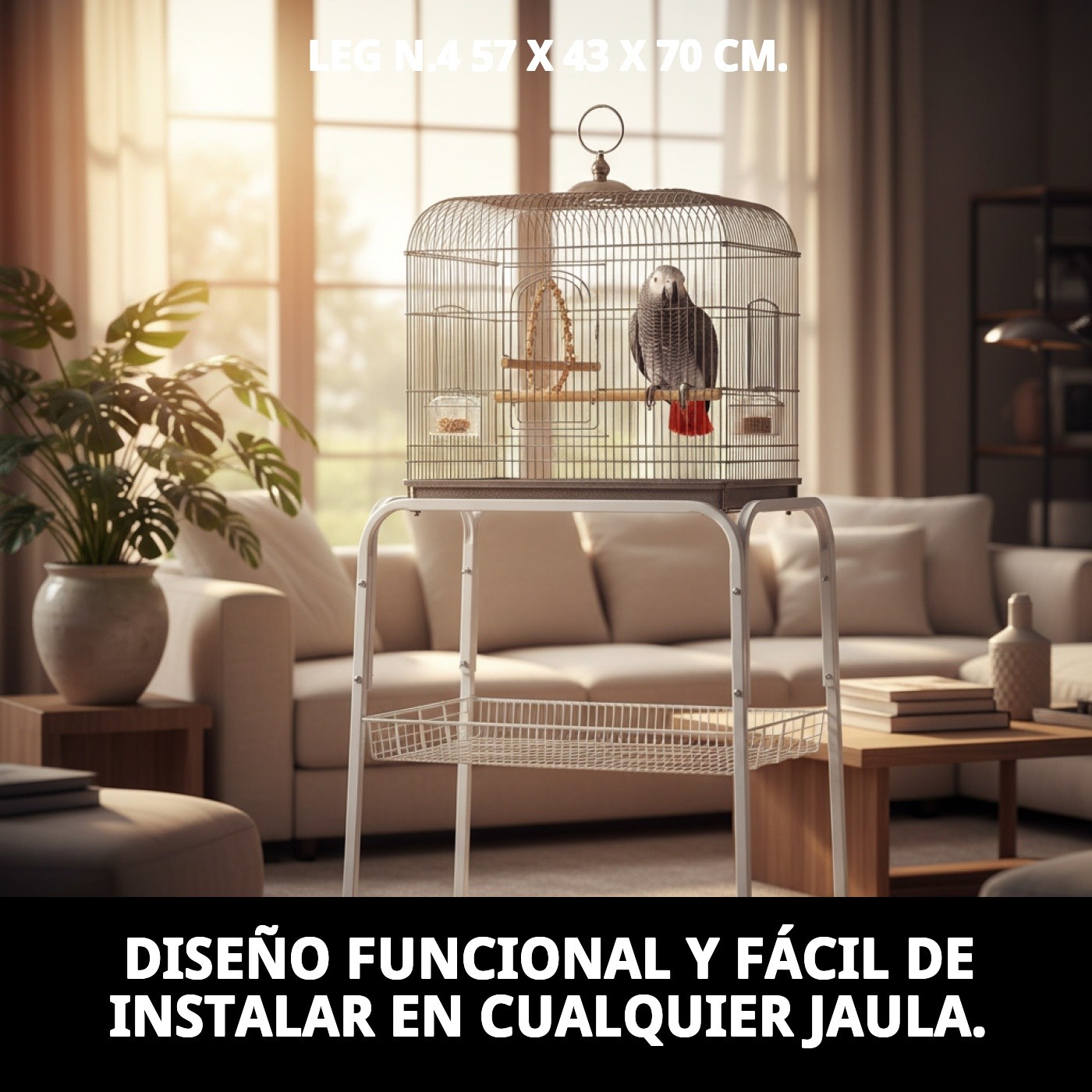El PIE N.4 ofrece unas dimensiones de 57 x 43 x 70 cm, lo que lo convierte en un soporte ideal para jaulas de tamaño medio. Su diseño desmontable no solo permite un fácil transporte, sino que también facilita su almacenamiento cuando no lo necesitas. ¡Adiós al desorden!