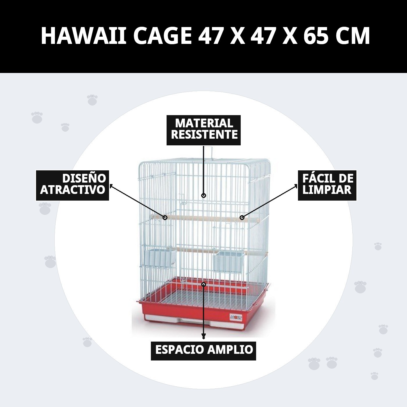 La jaula Hawái (47 x 47 x 65 cm) es la opción ideal para tus mascotas. Con su diseño desmontable y pies, facilita el transporte y almacenamiento. Asegura un espacio cómodo y seguro para tu compañero peludo, permitiendo que se sienta a gusto y protegido. ¡Haz que tu mascota disfrute de su nuevo hogar!