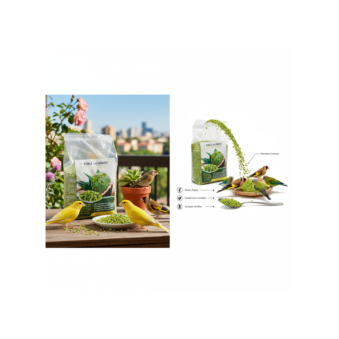 Perle Morbide 800 g es un alimento aviario completo diseñado para aportar una dieta equilibrada y de fácil asimilación. Su formato en perlas germinadas permite obtener una textura suave tras hidratación, similar a semillas germinadas, pero con mayor comodidad y rapidez.