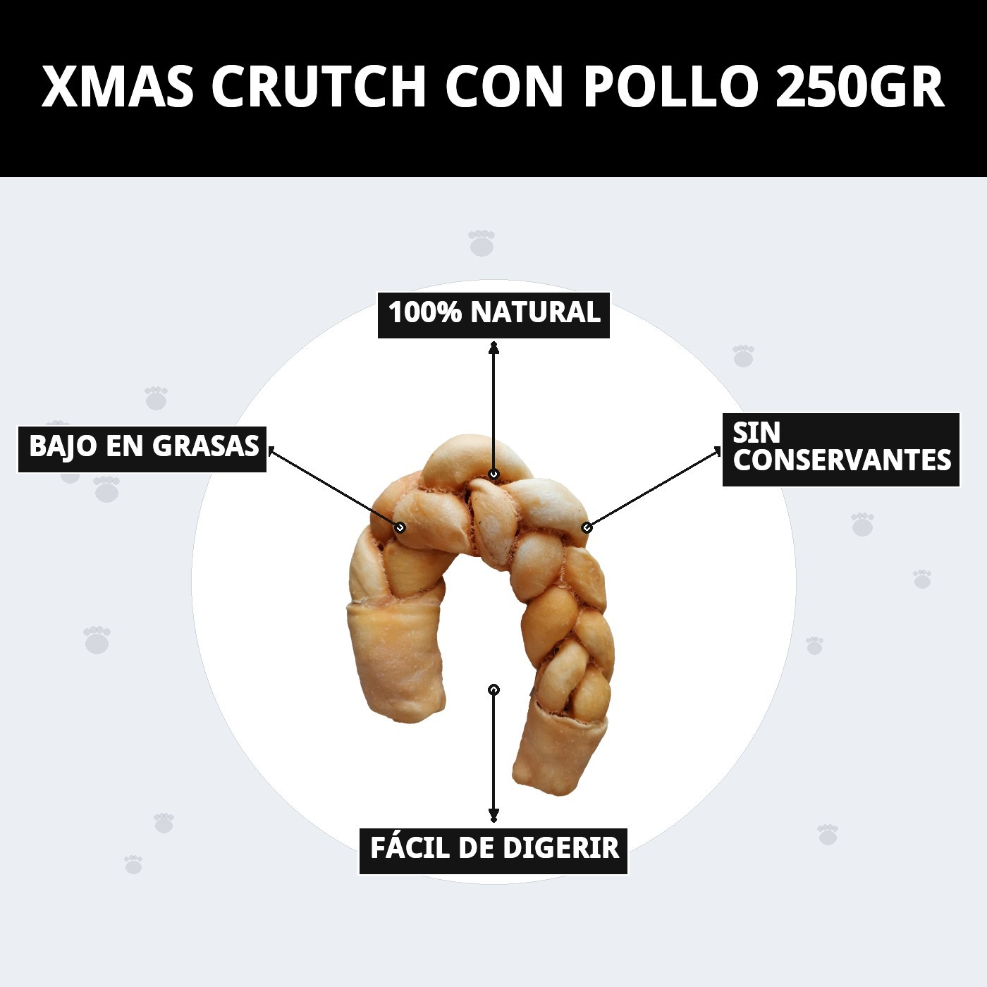 La XMAS CRUTCH CON POLLO es una trenza de piel prensada que está envuelta en suculento filete de pollo. Con un peso aproximado de 250 gramos, este snack no solo es sabroso, sino que también es nutritivo. ¿Te imaginas la cara de felicidad de tu perro al darle un bocado a esta deliciosa golosina? Sin duda, es un momento que vale la pena compartir.
