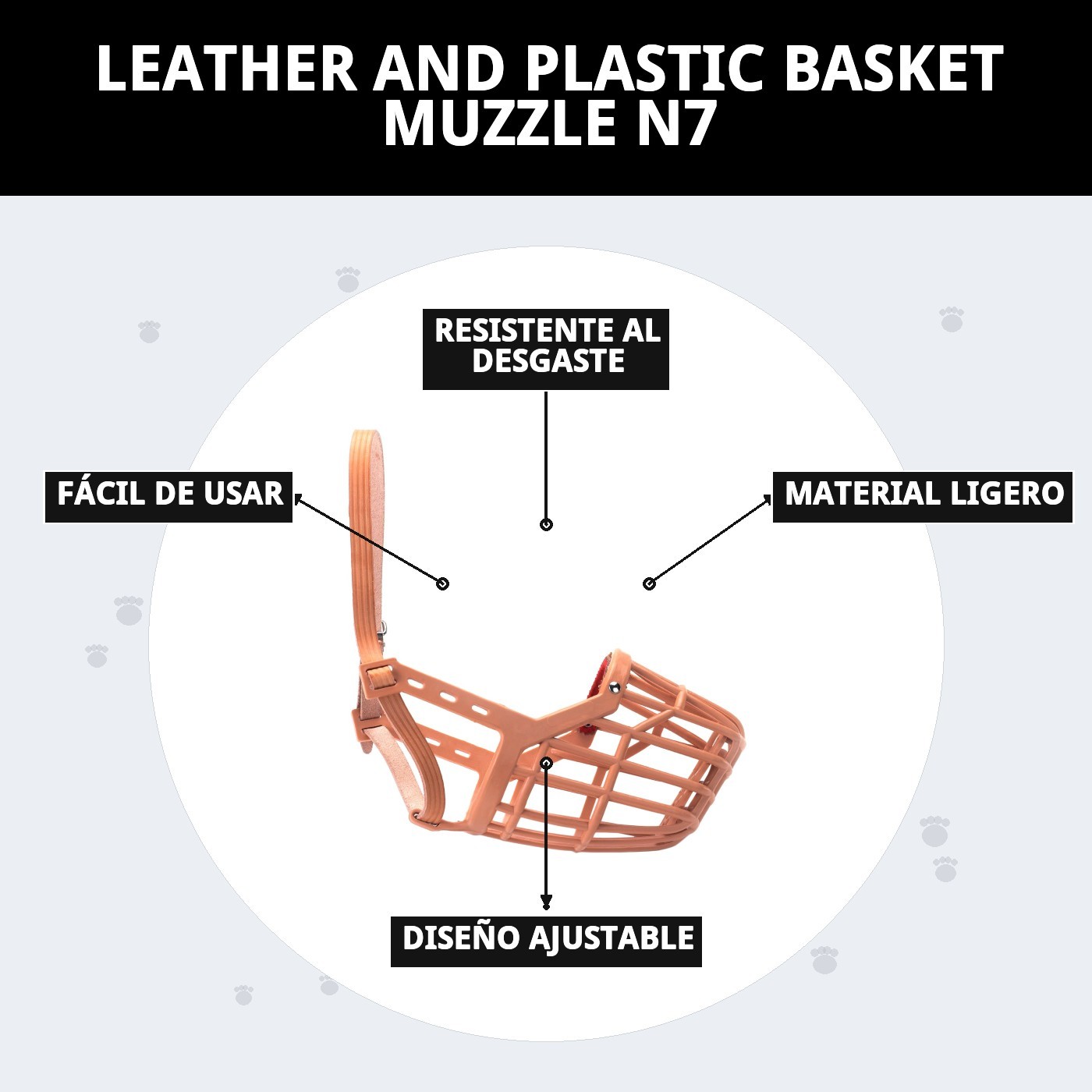 Este bozal destaca por su combinación de materiales que garantizan durabilidad y confort. La cesta de plástico permite que tu perro respire cómodamente y te brinda la tranquilidad de que no podrá morder ni ingerir objetos indeseados. Además, el cuero en la parte de la correa añade un toque de elegancia y resistencia, asegurando que el bozal no solo sea funcional, sino también atractivo.