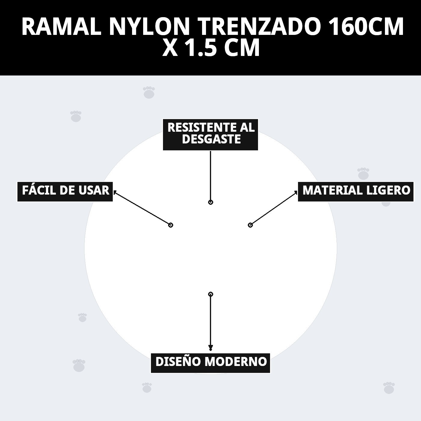 El ramal nylon trenzado tiene unas medidas de 160 cm de longitud y 1,5 cm de ancho, lo que lo convierte en un accesorio perfecto para perros de diferentes tamaños. Su diseño trenzado no solo aporta un toque estético, sino que también proporciona una mayor resistencia a la tracción. Esto significa que, incluso en los momentos más activos de tu perro, el ramal puede soportar el tirón sin ningún problema.