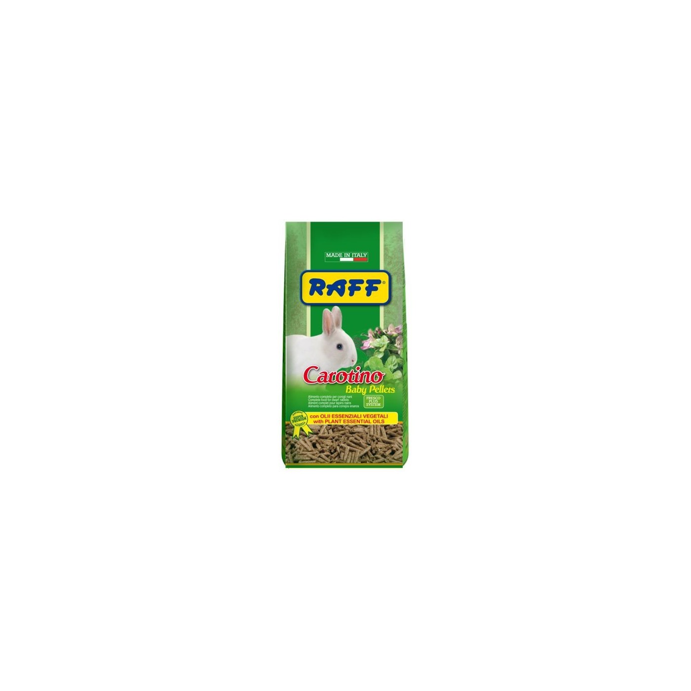 Raff Carotino Baby Pellets 900 g es un alimento completo en pellets, formulado específicamente para conejos baby y conejos enanos jóvenes que requieren un mayor aporte nutricional durante sus primeras etapas de crecimiento. Su fórmula Super Premium, enriquecida con aceites esenciales vegetales, proporciona energía de calidad, favorece una digestión saludable y contribuye al desarrollo adecuado del sistema inmunológico.